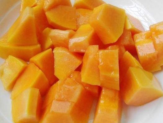 2、木瓜清洗干净之后削去皮对半切开,将里面的籽挖去,生姜清洗干净之后削成皮切成片放在一边备用,板栗去皮放在一边。